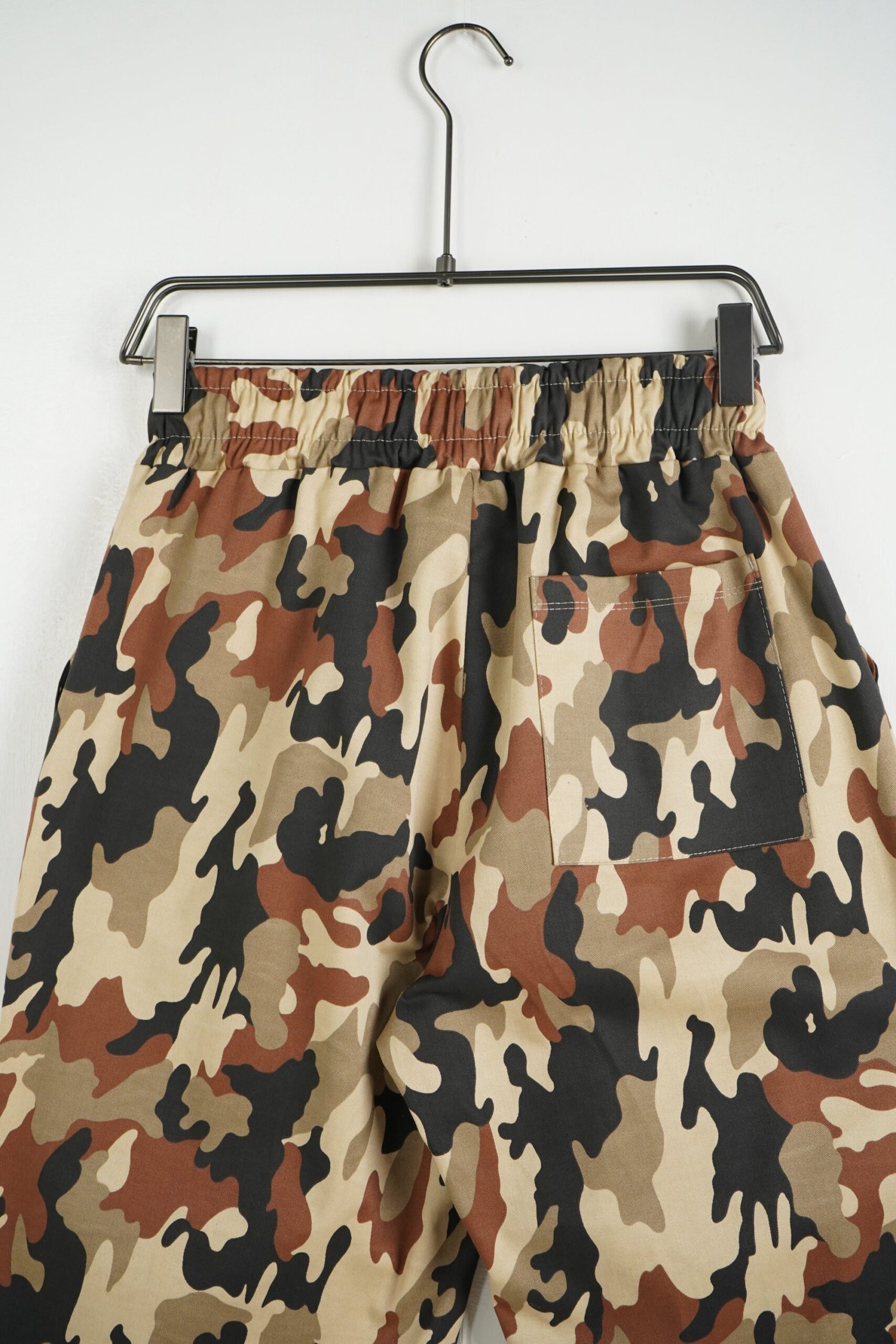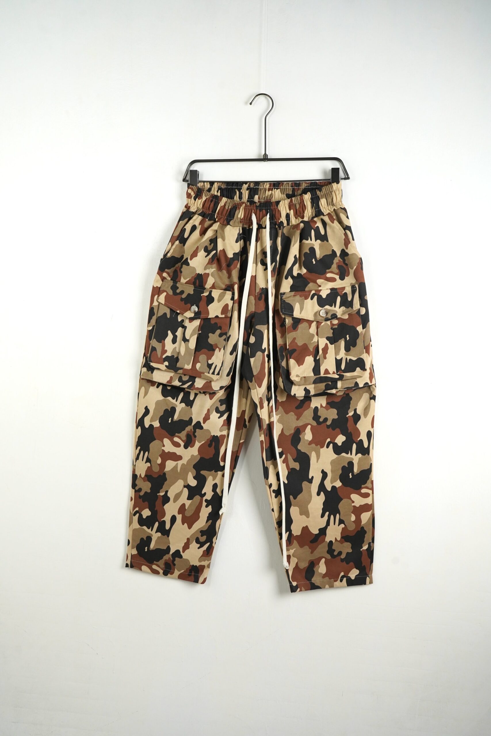 Pantalone oversize sartoriale cargo frontale, Brand DUCA HOMME, fantasia militare con elastico in vita e lacci lunghi. Nuova collezione Autunno/ Inverno 2025/26, Unisex. 100% MADE IN ITALY Realizzato in tessuto 99% Cotone 1% Elastene